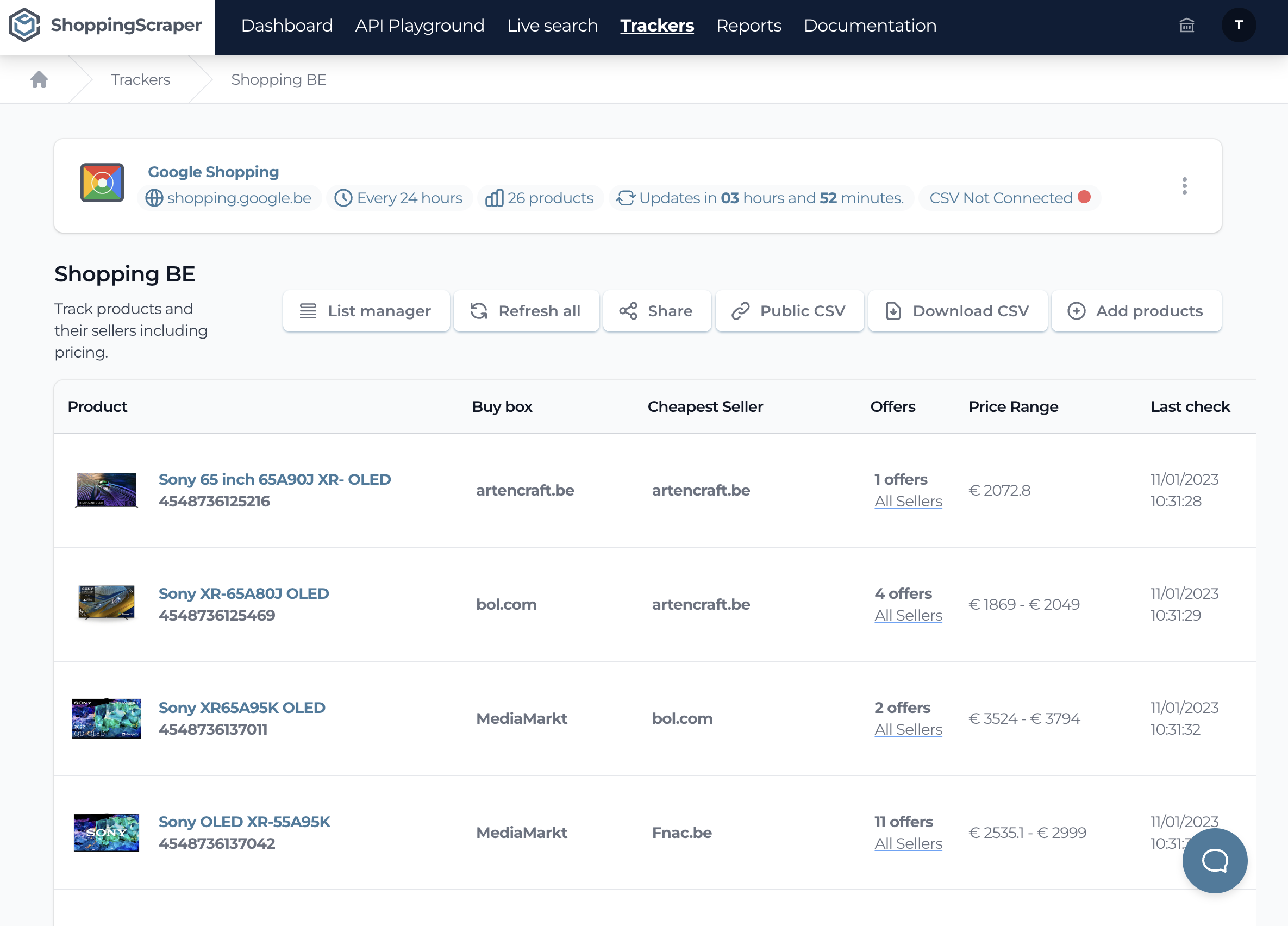 Once you've added your EAN codes, just sit back, relax and let ShoppingScraper do the heavy lifting for you. In no time, you'll have all the data you need - buy box owner, cheapest sellers, price ranges and even seller prices all at your finger tips. And if you want to collaborate, share your dashboard with a colleague.
