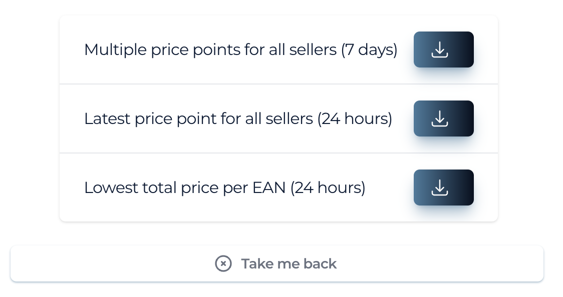 And when it's time to download or export the pricing data, ShoppingScraper has got you covered. You can use the download functionality to get a CSV file of the data, or use the public CSV functionality to access a fixed link with three files containing all scraped data from the last week, all data from the last 24 hours, and the cheapest data from the last 24 hours.